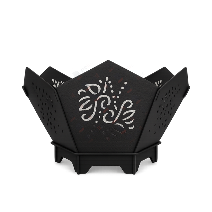 Nowoczesne palenisko dekoracyjne NATI to połączenie funkcjonalności i elegancji. Wykonane z czarnej, matowej stali malowanej proszkowo, zachwyca minimalistycznym designem i odpornością na warunki atmosferyczne. Jego ozdobne wycięcia w stylu floralnym tworzą efektowne refleksy ognia, które wprowadzają wyjątkowy klimat do ogrodu, tarasu czy działki.
